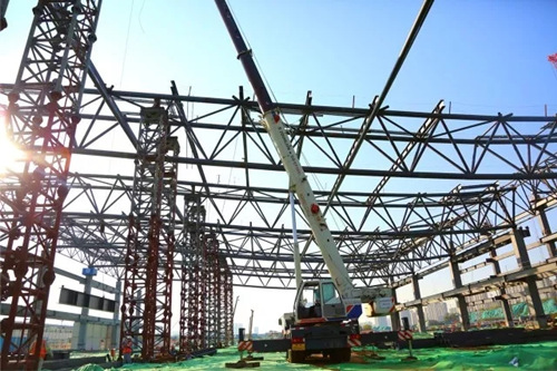四號展館屋面桁架吊裝在進行中。