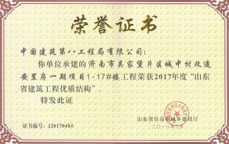 質(zhì)量是企業(yè)的生命。在山東省住房和城鄉(xiāng)建設(shè)廳組織的2017年度“山東省建筑工程優(yōu)質(zhì)結(jié)構(gòu)”評審中,吳家堡片區(qū)安置房一期工程1#到17#樓(共計17棟樓),憑借過硬的質(zhì)量、完善的管理順利通過專家考評,喜獲“山東省建筑工程優(yōu)質(zhì)結(jié)構(gòu)”。“山東省建筑工程優(yōu)質(zhì)結(jié)構(gòu)”代表著全省各建筑企業(yè)施工質(zhì)量管理的領(lǐng)先水平,為沖刺山東省建筑工程質(zhì)量最高榮譽“泰山杯”奠定了基礎(chǔ)。