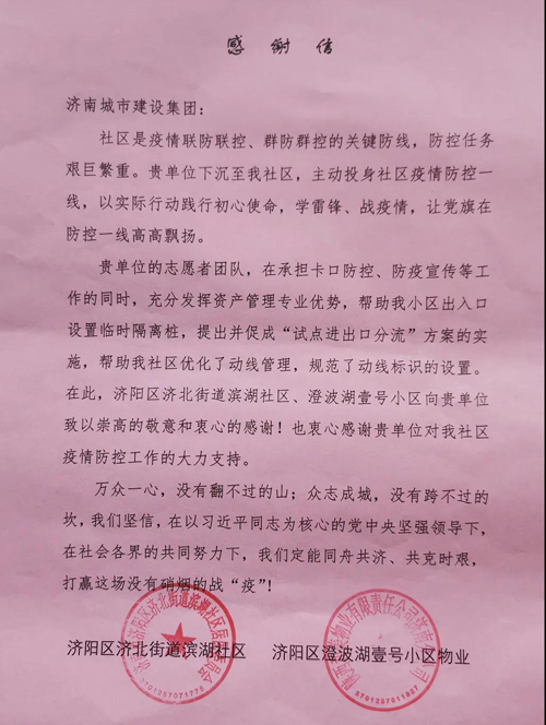 4月20日下午,在集團(tuán)第十一批下沉社區(qū)疫情防控服務(wù)隊(duì)即將完成執(zhí)勤任務(wù)之時,濟(jì)陽、濟(jì)北街道社區(qū)將四面錦旗和一封飽含深情的感謝信送到志愿者手中,表達(dá)對濟(jì)陽、濟(jì)北小組志愿者的感謝與認(rèn)可。