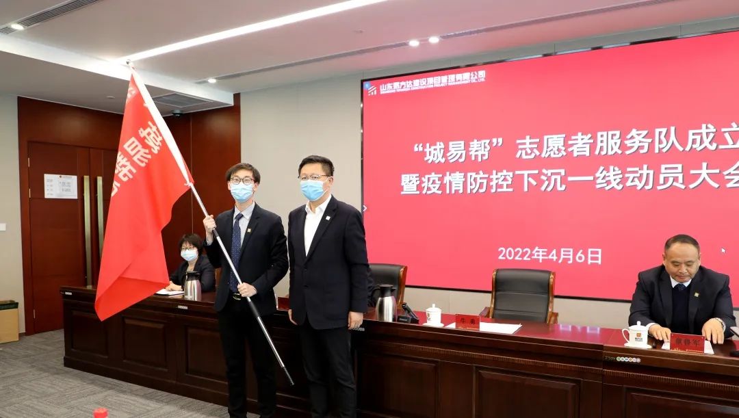 會議宣讀了公司工會關于《山東易方達建設項目管理有限公司關于成立“城易幫”志愿者服務隊的決定》,公司黨委書記、董事長牛勇向“城易幫”志愿者服務隊進行授旗。