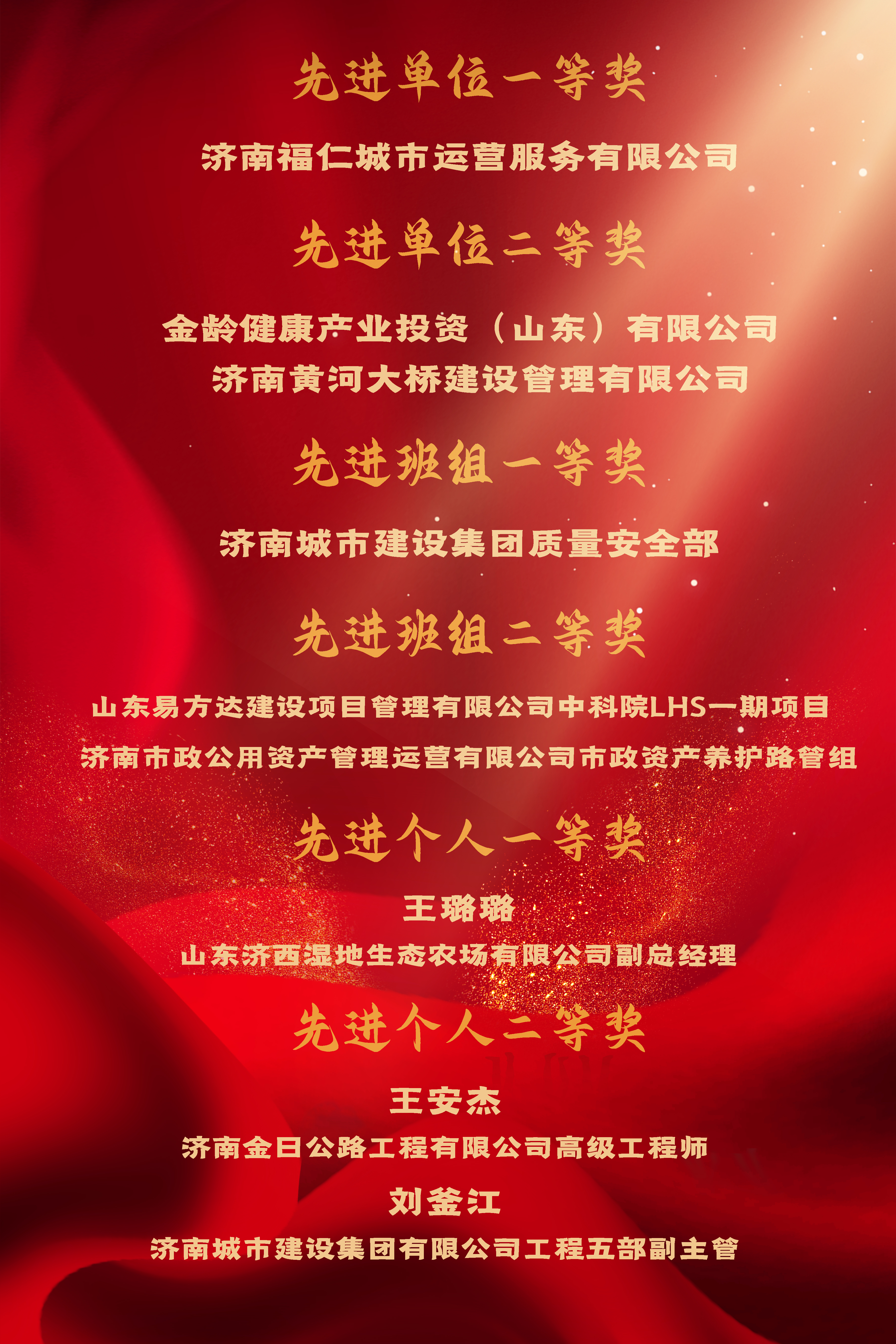 會上宣讀了《關于表揚2022年建設強省會勞動競賽先進集體和先進個人的通報》,獲得勞動競賽一等獎的30個單位獲頒濟南市五一勞動獎狀、30個班組獲頒濟南市工人先鋒號、80名職工獲頒濟南市五一勞動獎章。其中,建設集團3家公司獲先進單位稱號,3個班組獲先進班組稱號,3名同志獲先進個人稱號。