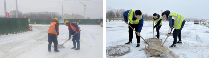 各項目在接到降雪預報后,按照要求提前做好各項清雪除冰準備工作,并安排人員在崗值守,密切關注雪情路況,第一時間撒布融雪劑、鏟雪、除冰,機械作業與人工作業交替進行,對重點路段進行鏟、推、掃、堆一體化循環作業,加快清理道路積雪,為來往行人車輛清理出安全整潔的通道,為市民群眾平安出行保駕護航。
