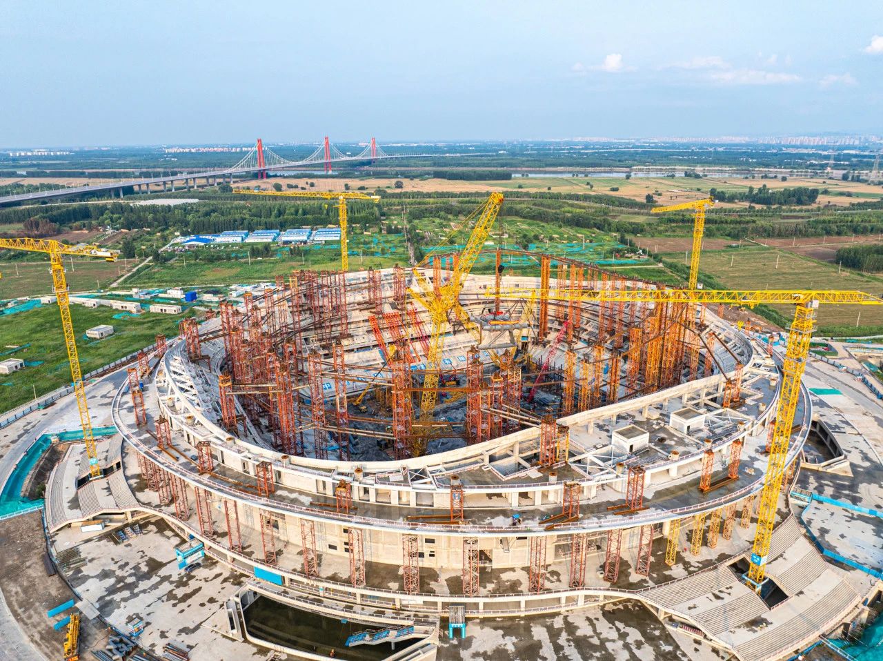 本次實(shí)施的首次吊裝段,位于內(nèi)環(huán)桁架,單元吊重達(dá)168噸,起吊縱深高達(dá)60余米。項(xiàng)目位于濟(jì)南新舊動(dòng)能轉(zhuǎn)換起步區(qū),建筑面積19.73萬(wàn)平方米,建筑高度為60米,是山東省首個(gè)6萬(wàn)座專(zhuān)業(yè)足球場(chǎng),可承辦國(guó)際、國(guó)內(nèi)重大體育賽事。同時(shí)也是國(guó)內(nèi)體育場(chǎng)館懸挑長(zhǎng)度最大的工程,最大懸挑長(zhǎng)度達(dá)到了45米,屋蓋鋼結(jié)構(gòu)由星形拱桁架、內(nèi)環(huán)桁架、外環(huán)桁架、單層網(wǎng)格及挑檐組成,總鋼量約3.1萬(wàn)噸,靠36根排架柱支撐,形成巨型無(wú)柱大懸挑空間,在整體結(jié)構(gòu)中起到了承上啟下作用,下方排架柱與混凝土結(jié)構(gòu)相連,上方支撐索結(jié)構(gòu)、膜結(jié)構(gòu)。項(xiàng)目預(yù)計(jì)在2026年底竣工驗(yàn)收完成。