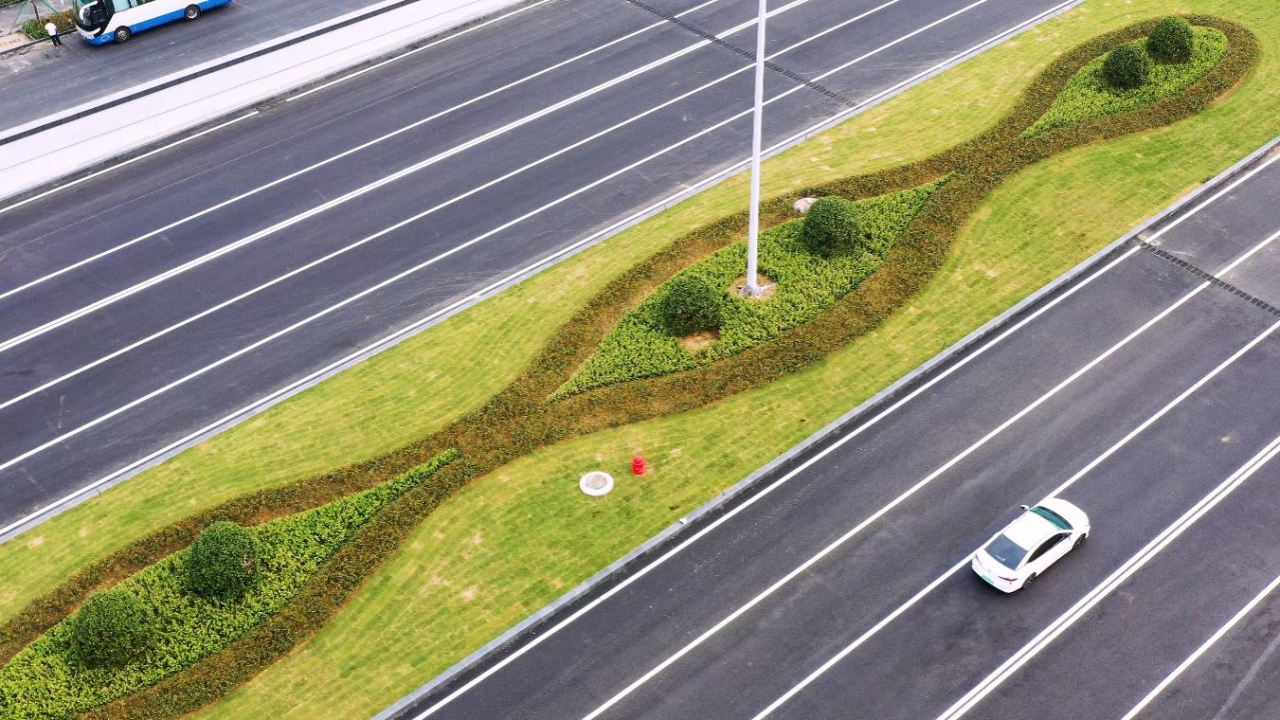 高架橋上采用了創新性非線性排水溝,兼顧橋面排水需求,造價低,施工簡單,耐久性好。道路周邊精心設計了綠植造型,下穿隧道采用了藍色星空頂,園林小品的愜意和藍色星空隧道的靚麗,為濟南機場增添了一抹亮色。在后續的規劃中,還將有車輛隧道下穿停機坪,未來,上行飛機、下行車輛,飛機和汽車將實現“空陸同框”。